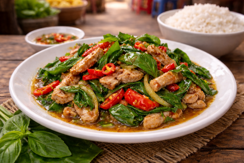 Cha Kdao ist ein würziges Wokgericht aus der kambodschanischen Küche. Besonders typisch ist die Kombination aus Fleisch, Chili, Knoblauch und frischem Basilikum. Das Basilikum gibt dem Gericht sein charakteristisches Aroma.